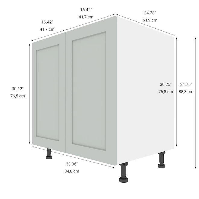- Adjustable legs allow for floor irregularities, total base cabinet height range 34-In – 35-In