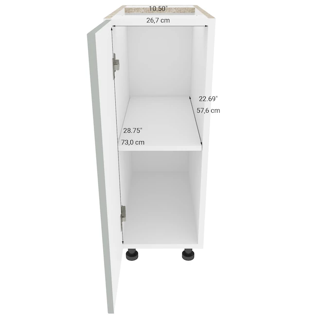 Classic, timeless and practical, this Eklipse base cabinet is perfect for your new kitchen. It’s made of high-quality white polymer with a satin finish. It features adjustable hinges, an integrated soft-close function and adjustable legs. Pair it with the other Eklipse units to complete the look. This product is backed by a 1-year warranty against manufacturing defects.