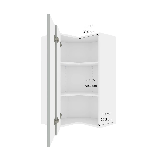 From the transitional-style Angelite collection the corner wall cabinet Eklipse from EBSU comports 2 doors coated of a durable thermoplastic. The cabinet is equipped with high-quality soft-close hinges and 3 adjustable shelves. The module has a frameless design that optimizes storage. Pre-assembled, the unit made of particle board with a melamine finish is ready for an easy and quick installation. This product is made in Canada and backed by a limited lifetime warranty.