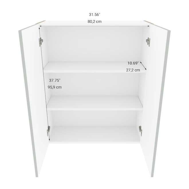 From the transitional-style Angelite collection the wide wall cabinet Eklipse from EBSU comports 2 doors equipped high-quality soft-close hinges and 3 shelves. The module has a frameless design that optimizes storage. Pre-assembled, the unit made of particle board with a melamine finish is ready for an easy and quick installation. This product is made in Canada and backed by a limited lifetime warranty.