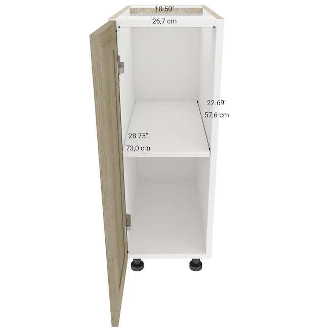 Eklipse kitchen cabinets by EBSU are already assembled, ready to install, making them an easy and quick solution for creating your next kitchen setup. Eklipse Coral cabinets feature a 3/4-in melamine panel with authentic natural wood look, without the maintenance real wood would require. Cabinets are frameless designed to optimize storage space, and feature doors each with a slow-close mechanism. Eklipse cabinets are manufactured in Canada and include high-end hardware as well as adjustable legs. This 1-door base cabinet has a nominal width of 12-in and a nominal depth of 24-in.