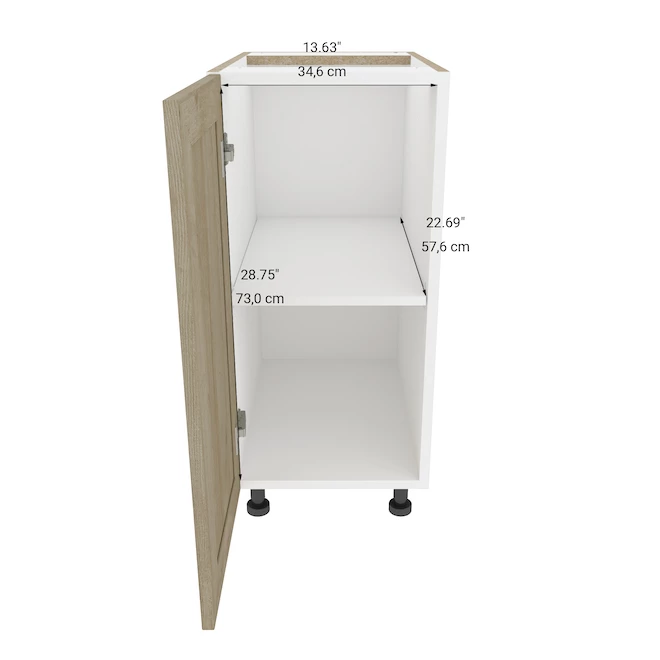 Eklipse kitchen cabinets by EBSU are already assembled, ready to install, making them an easy and quick solution for creating your next kitchen setup. Eklipse Coral cabinets feature a 3/4-in melamine panel with authentic natural wood look, without the maintenance real wood would require. Cabinets are frameless designed to optimize storage space, and feature doors each with a slow-close mechanism. Eklipse cabinets are manufactured in Canada and include high-end hardware as well as adjustable legs. This 1-door base cabinet has a nominal width of 15-in and a nominal depth of 24-in.