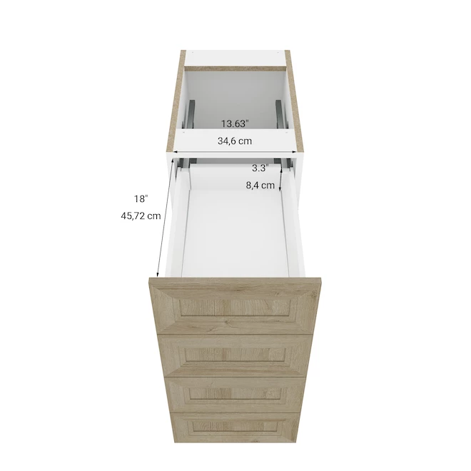 Eklipse kitchen cabinets by EBSU are already assembled, ready to install, making them an easy and quick solution for creating your next kitchen setup. Eklipse Coral cabinets feature a 3/4-in melamine panel with authentic natural wood look, without the maintenance real wood would require. Cabinets are delivered with full extension drawers that each include a soft-close mechanism. Eklipse cabinets are manufactured in Canada and include high-end hardware as well as adjustable legs. This 4-drawer base cabinet has a nominal width of 15-in and a nominal depth of 24-in.
