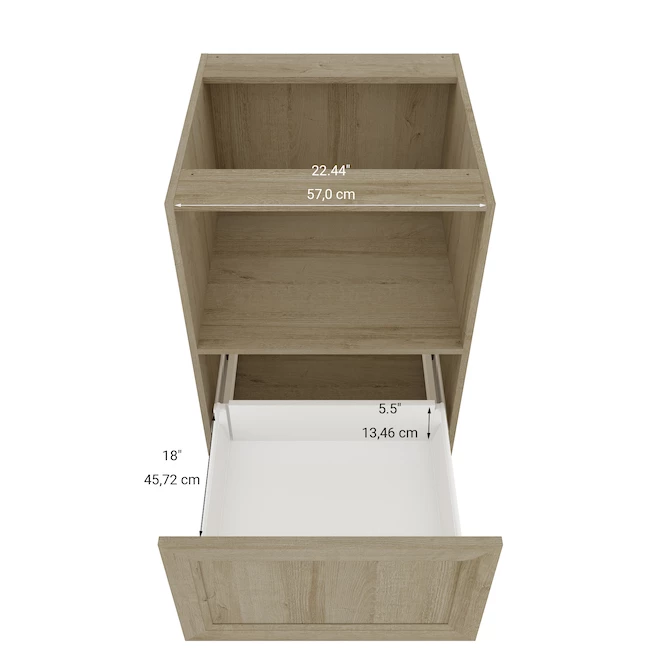 - MDF shaker style drawer front in a natural oak polyester woodgrain finish with 5/8-In melamine panel construction