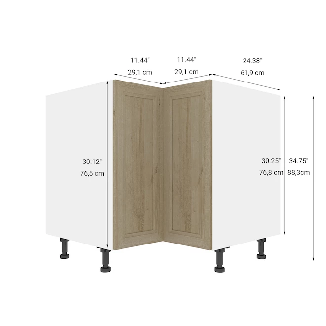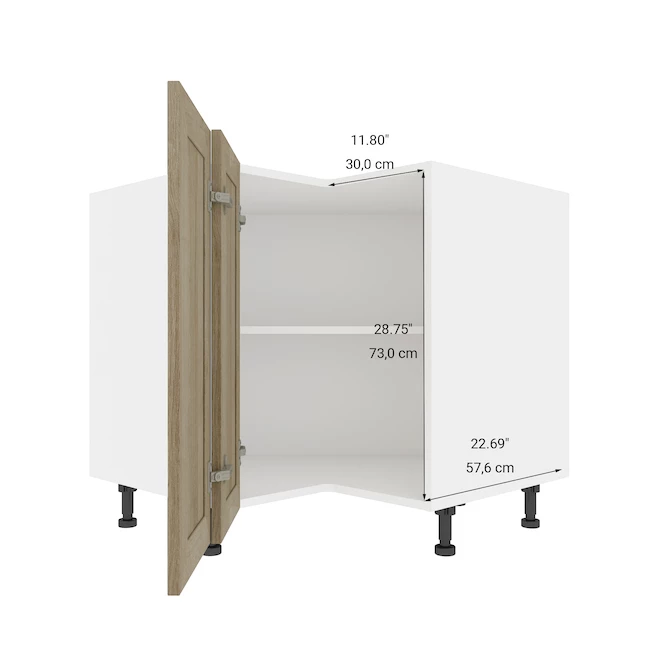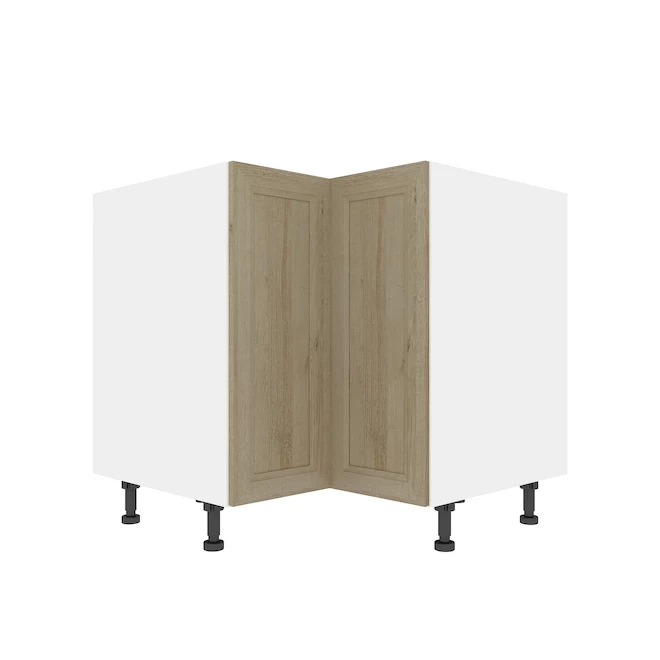 Eklipse kitchen cabinets by EBSU are already assembled, ready to install, making them an easy and quick solution for creating your next kitchen setup. Eklipse Coral cabinets feature a 3/4-in melamine panel with authentic natural wood look, without the maintenance real wood would require. Cabinets are frameless designed to optimize storage space, and feature doors each with a slow-close mechanism. Eklipse cabinets are manufactured in Canada and include high-end hardware as well as adjustable legs. This 2-door base corner cabinet has a nominal width of 36-in and a nominal depth of 36-in.