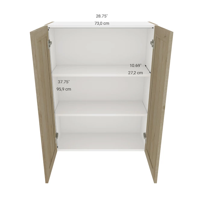 From the rustic-style Coral collection the tall wall cabinet Eklipse from EBSU comports 2 doors equipped with high-quality soft-close hinges and 3 adjustable shelves. The module has a frameless design that optimizes storage. Pre-assembled, the unit made of particle board with a melamine finish is ready for an easy and quick installation. This product is made in Canada and backed by a limited lifetime warranty.
