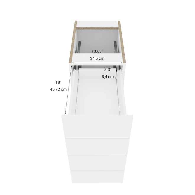 - Melamine drawer front in a natural white finish with 3/4-In melamine panel construction