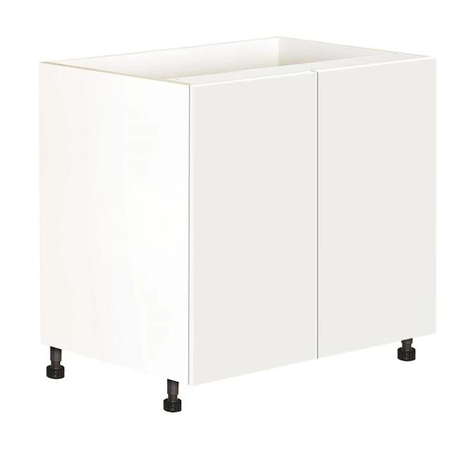 Eklipse cabinets are already assembled and ready to install, for an easy and quick solution. This Eklipse by EBSU Moonstone 36-inch base cabinet is equipped with high-quality soft-close hinges, has adjustable legs and is frameless which provides more storage space. This 3/4-inch white melamine cabinet is manufactured in Canada.