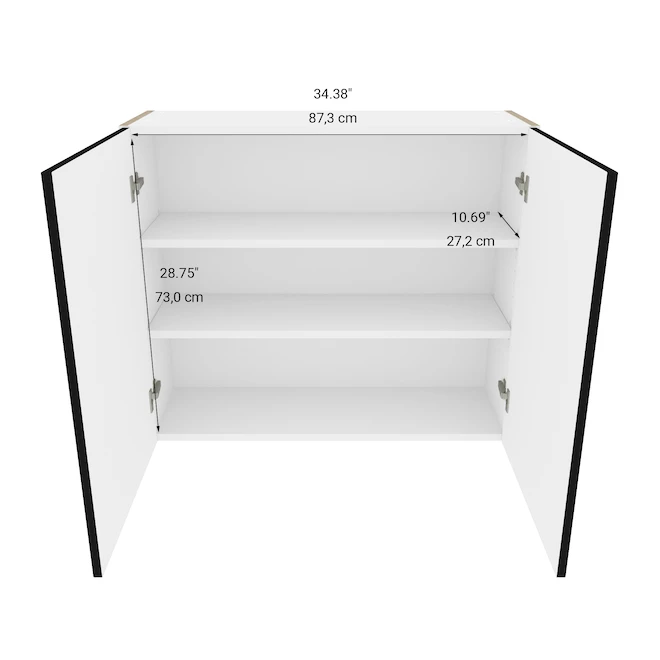 Eklipse cabinets are already assembled and ready to install, for an easy and quick solution. This Eklipse by EBSU Onyx 36-inch 2-door wall cabinet is equipped with high-quality soft-close hinges and is frameless which provides more storage space. Manufactured in Canada.