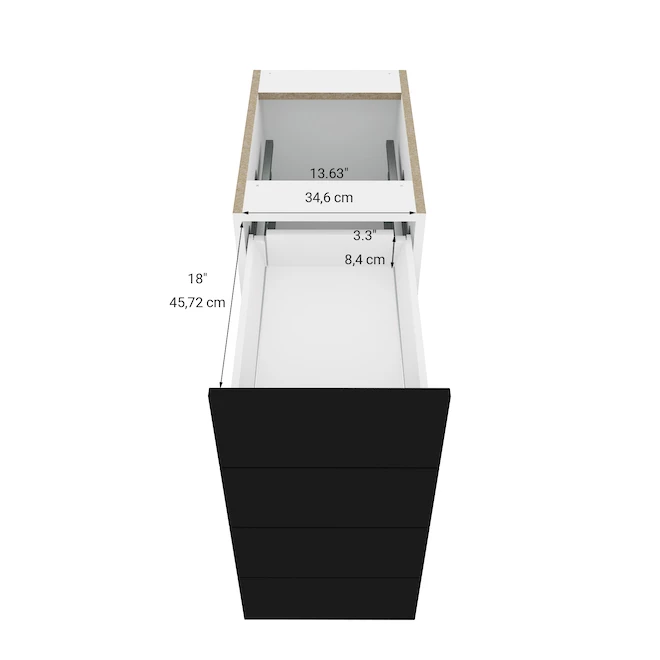 - MDF drawer front in black polymer satin finish with 3/4-In melamine panel construction