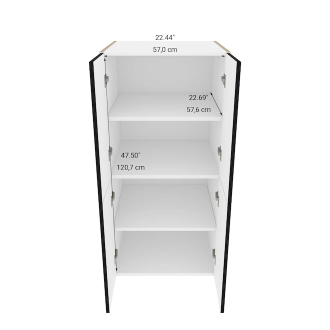 This Eklipse by EBSU 24-inch top pantry cabinet features 4 soft-close matte black doors with a flat surface. The cabinet is frameless for more storage space and has a superior 3/4-inch white melamine construction. This product is manufactured in Canada.