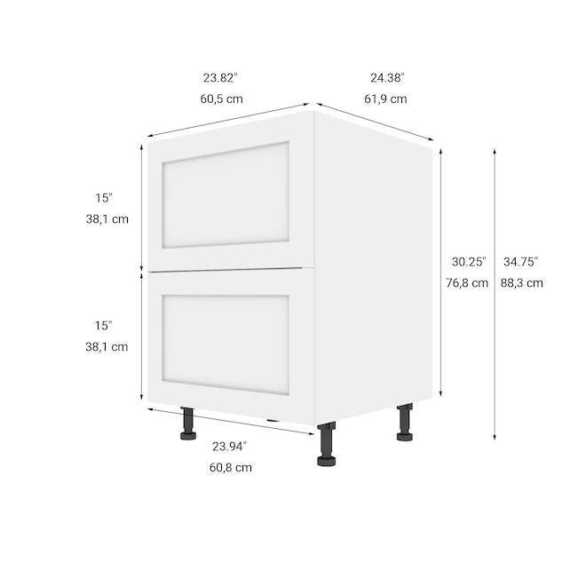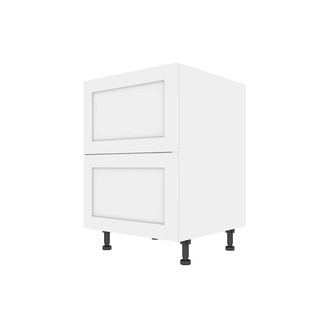 This shaker style 24-in Eklipse base cabinet by EBSU is already assembled and ready for installation. It has a superior 3/4-in melamine construction and 2 soft-close polymer drawers that extend fully. This cabinet from the Perle collection includes adjustable legs and is manufactured in Canada.
