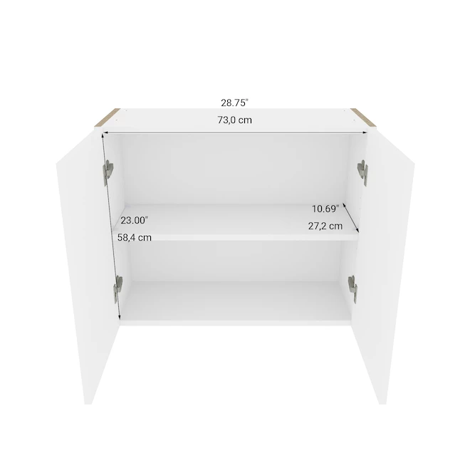 From the transitional-style Perle collection the medium wall cabinet Eklipse from EBSU comports 2 doors equipped high-quality soft-close hinges and 1 shelf. The module has a frameless design that optimizes storage. Pre-assembled, the unit made of particle board with a melamine finish is ready for an easy and quick installation. This product is made in Canada and backed by a limited lifetime warranty.