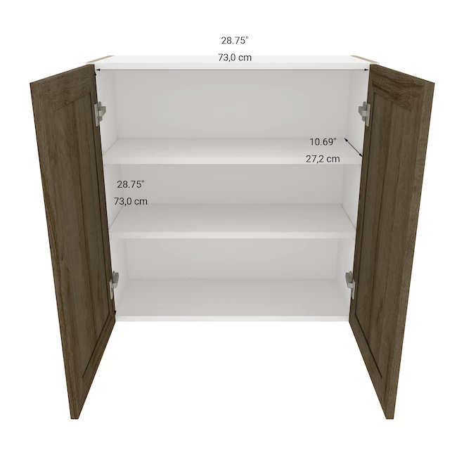 Manufactured in Canada with high-end hardware and soft-close doors, Eklipse cabinets by EBSU are a cost-effective, reliable solution when it comes to kitchen rework. This Eklipse Ruby wall cabinet comes pre-assembled and ready to install. The 3/4-in melamine panel features a real wood-like finish with a gradient of warm colours for rustic inspirations. The raised edge generates depth perception. The frameless cabinet design optimizes storage space. This 2-door kitchen cabinet has a nominal width of 30-in and a nominal depth of 12-in.