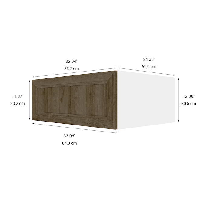 Manufactured in Canada with high-end hardware and soft-close doors, Eklipse cabinets by EBSU are a cost-effective, reliable solution when it comes to kitchen rework. This Eklipse Ruby wall cabinet comes pre-assembled and ready to install. The 3/4-in melamine panel features a real wood-like finish with a gradient of warm colours for rustic inspirations. The raised edge generates depth perception. The frameless cabinet design optimizes storage space. This 2-door kitchen cabinet has a nominal width of 33-in and a nominal depth of 24-in.