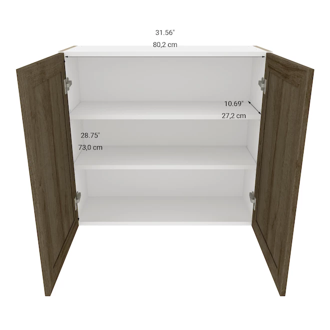 Manufactured in Canada with high-end hardware and soft-close doors, Eklipse cabinets by EBSU are a cost-effective, reliable solution when it comes to kitchen rework. This Eklipse Ruby wall cabinet comes pre-assembled and ready to install. The 3/4-in melamine panel features a real wood-like finish with a gradient of warm colours for rustic inspirations. The raised edge generates depth perception. The frameless cabinet design optimizes storage space. This 2-door kitchen cabinet has a nominal width of 33-in and a nominal depth of 12-in.