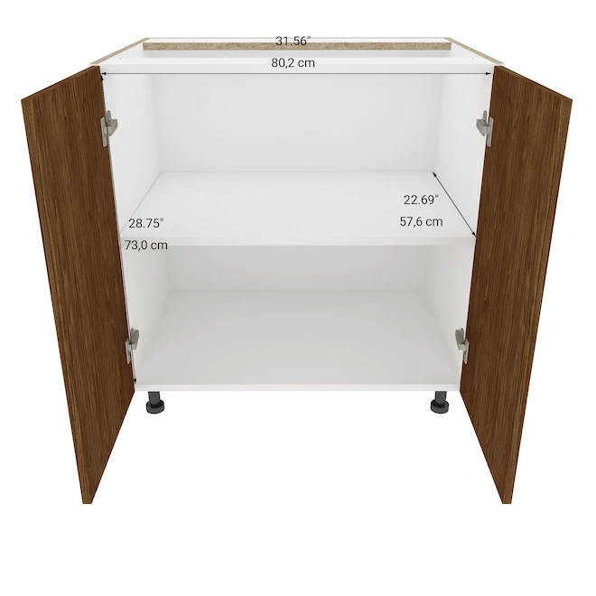 Create a stylish kitchen space with this 33-inch woodgrain Eklipse base cabinet by EBSU. Assembled and ready for installation, it features a superior 3/4-in melamine construction and 2 soft-close doors with a flat surface. This cabinet from the Saphir collection includes adjustable legs and has a frameless design which offers more storage space. Pair it with other cabinets from Eklipse for a coordinated look and choose beautiful door handles (sold separately). This product is manufactured in Canada.