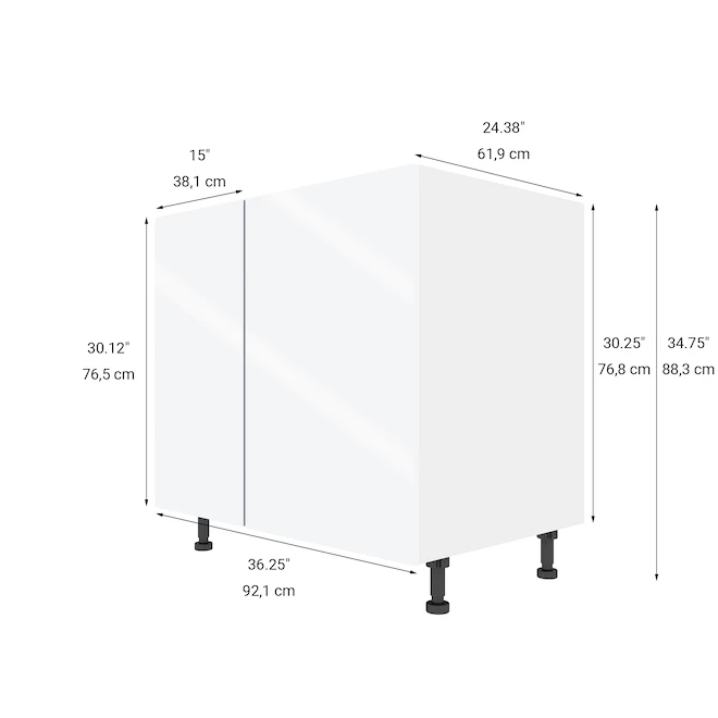 - Adjustable legs allow for floor irregularities, total base cabinet height range 34-In – 35-In